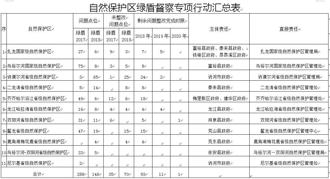 1.深入開(kāi)展自然保護(hù)區(qū)綠盾督察專項(xiàng)行動(dòng)問(wèn)題整改。截至2018年6月13日,“綠盾2017”專項(xiàng)行動(dòng)確定問(wèn)題點(diǎn)位288個(gè),已完成整改253個(gè);“綠盾2018”專項(xiàng)行動(dòng)確定問(wèn)題點(diǎn)位146個(gè),已完成整改76個(gè);綜合整改率75.8%。各責(zé)任單位要在已建立問(wèn)題臺(tái)賬清單基礎(chǔ)上,對(duì)突出問(wèn)題再梳理,堅(jiān)持整改原則,限期分類處置。要嚴(yán)格整改標(biāo)準(zhǔn),對(duì)于事實(shí)清楚、查處依據(jù)充分的問(wèn)題迅速行動(dòng)、立行立改;對(duì)于暫不能完成的問(wèn)題制定臺(tái)賬和整改措施,明確整改時(shí)限,實(shí)行整改包保制,拉條掛賬、跟蹤問(wèn)效、督辦落實(shí)、辦結(jié)銷號(hào),將問(wèn)題堅(jiān)決整改到位。剩余105個(gè)未完成整改的問(wèn)題點(diǎn)位,2018年完成整改93個(gè),綜合整改率達(dá)到97.2%;2019年完成整改11個(gè),綜合整改率達(dá)到99.8%;2020年完成整改1個(gè),綜合整改率達(dá)到100%。(責(zé)任單位:訥河市政府、龍江縣政府、富??h政府、泰來(lái)縣政府、拜泉縣政府、克山縣政府、克東縣政府、依安縣政府、甘南縣政府、昂昂溪區(qū)政府、梅里斯區(qū)政府、鐵鋒區(qū)政府、建華區(qū)政府、扎龍國(guó)家級(jí)自然保護(hù)區(qū)管理局、省農(nóng)墾總局九三管理局)