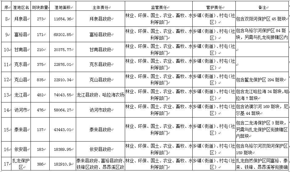 2.明確濕地斑塊管護(hù)責(zé)任。以濕地斑塊為單元,把濕地斑塊管護(hù)責(zé)任落實(shí)到鄉(xiāng)鎮(zhèn)(街道)、村屯(社區(qū)),所有濕地斑塊明確管護(hù)責(zé)任人,建立完善鄉(xiāng)鎮(zhèn)(街道)、村屯(社區(qū))管護(hù)責(zé)任機(jī)制。按照《黑龍江省濕地保護(hù)修復(fù)工作實(shí)施方案》要求,在列入名錄中的濕地的顯著位置樹(shù)立濕地標(biāo)示牌,標(biāo)明濕地面積、級(jí)別、類型、四至范圍、主管部門(mén)和管護(hù)責(zé)任人等內(nèi)容。此項(xiàng)工作2019年底前完成?!藏?zé)任單位:各縣(市)區(qū)政府、扎龍國(guó)家級(jí)自然保護(hù)區(qū)管理局、省農(nóng)墾總局九三管理局〕