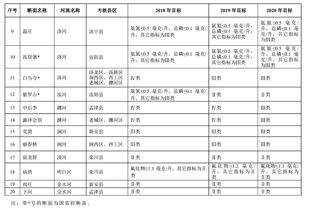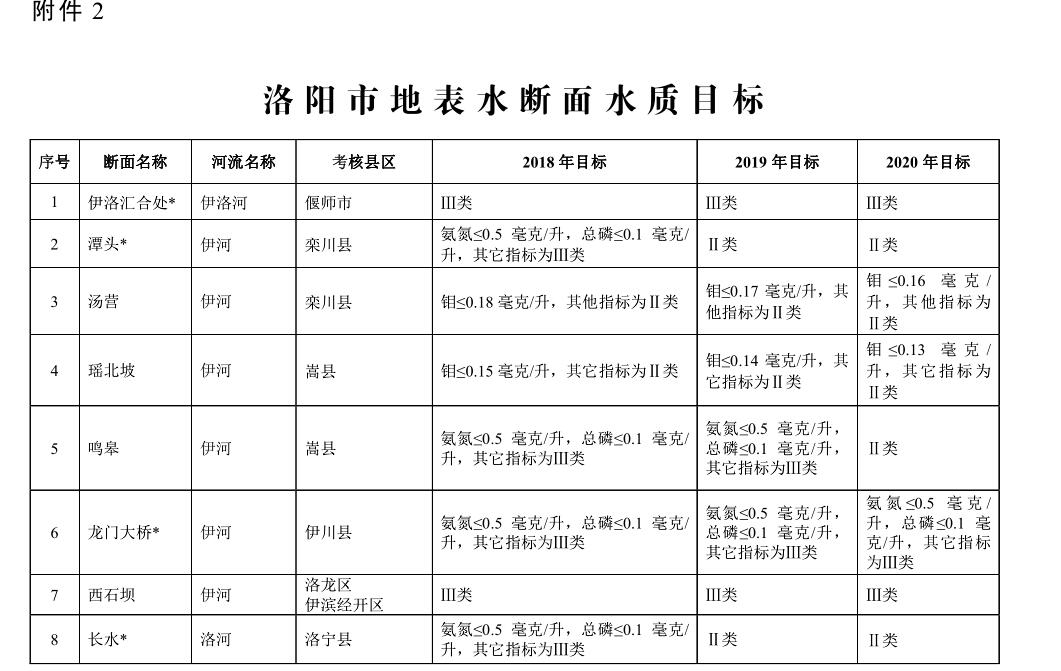 3. 2020 年度目標(biāo) 全市氮氧化物減排 30220 噸,二氧化硫減排 27880 噸。全市 PM 2.5 (細(xì)顆粒物)年均濃度達(dá)到 54 微克/立方米以下,PM 10 (可吸入顆粒物)年均濃度達(dá)到 95 微克/立方米以下,城市區(qū)優(yōu)良天數(shù)達(dá)到 260 天以上。偃師市、孟津縣、新安縣、伊川縣、宜陽縣、吉利區(qū) PM 2.5 年均濃度達(dá)到 45 微克/立方米以下,汝陽縣、洛寧縣、欒川縣、嵩縣 PM 2.5 年均濃度達(dá)到 35 微克/立方米以下。全市地表水國、省重點(diǎn)監(jiān)控的 7 個(gè)斷面達(dá)到或優(yōu)于Ⅲ類水質(zhì)斷面比例保持 100%,其中伊河潭頭、洛河長水、汝河紫羅山斷面水質(zhì)保持或優(yōu)于Ⅱ類;市重點(diǎn)監(jiān)控?cái)嗝孢_(dá)到或優(yōu)于Ⅲ類水質(zhì)斷面比例達(dá)到 100%,其中伊河鳴皋斷面水質(zhì)達(dá)到或優(yōu)于Ⅱ類;全市縣級以上城市集中式飲用水水源地取水水質(zhì)達(dá)標(biāo)率達(dá)到 100%;全面消除縣城建成區(qū)黑臭水體,基本消除農(nóng)村地區(qū)黑臭水體、坑塘;地下水質(zhì)量考核點(diǎn)位水質(zhì)級別保持穩(wěn)定。