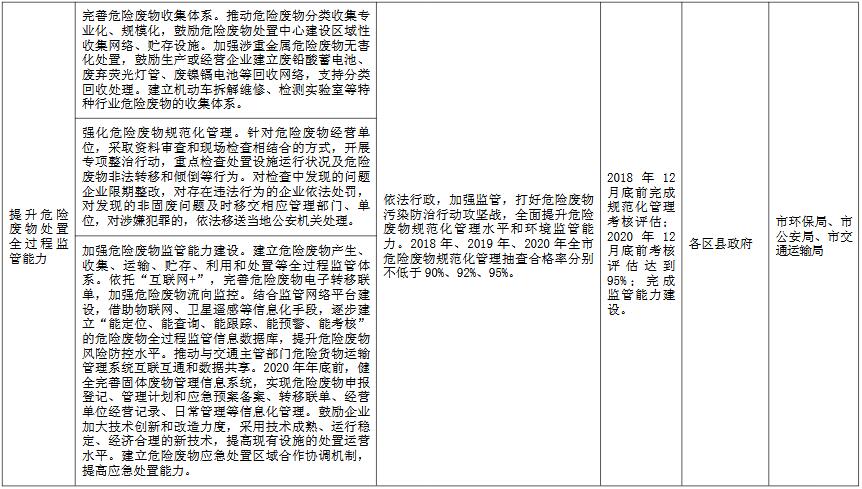 (四)嚴(yán)格環(huán)境監(jiān)管。創(chuàng)新監(jiān)管手段,健全監(jiān)管模式,實(shí)施最嚴(yán)格的全過(guò)程環(huán)境監(jiān)管措施,嚴(yán)防危險(xiǎn)廢物非法轉(zhuǎn)移、處置。嚴(yán)格執(zhí)行危險(xiǎn)廢物申報(bào)登記、轉(zhuǎn)移聯(lián)單、經(jīng)營(yíng)許可制度,進(jìn)一步加強(qiáng)危險(xiǎn)廢物規(guī)范化管理。強(qiáng)化危險(xiǎn)廢物跨區(qū)域轉(zhuǎn)移監(jiān)管,嚴(yán)格把控危險(xiǎn)廢物跨省市處置。持續(xù)開展危險(xiǎn)廢物規(guī)范化管理督查考核,定期公布結(jié)果,促進(jìn)環(huán)境監(jiān)管水平不斷提高。加強(qiáng)環(huán)保、公安、交通、安監(jiān)、衛(wèi)生等相關(guān)部門的聯(lián)勤聯(lián)動(dòng),嚴(yán)厲打擊危險(xiǎn)廢物非法排放、轉(zhuǎn)移、傾倒、處置等環(huán)境違法犯罪行為,建立聯(lián)合打擊危險(xiǎn)廢物犯罪長(zhǎng)效機(jī)制。