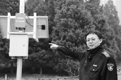 昌平區(qū)環(huán)保局工作人員手指的盒子就是“微站”的核心部件。設置在昌平公園內(nèi)的這個實時監(jiān)控PM2.5和PM10兩個因子的微型監(jiān)測站,可以實現(xiàn)每一分鐘向系統(tǒng)上傳一次數(shù)據(jù)。 本報記者童克難攝