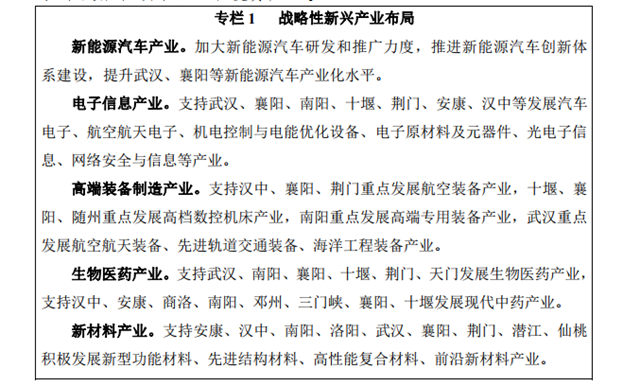 發(fā)揮武漢、襄陽、十堰、荊門、南陽、漢中等地創(chuàng)新資源優(yōu)勢, 積極培育新能源汽車、電子信息、高端裝備制造、生物醫(yī)藥、新材 料等產(chǎn)業(yè),打造一批新興產(chǎn)業(yè)基地。加強軍民融合創(chuàng)新示范,推進 軍民資源共享和軍民兩用技術(shù)雙向轉(zhuǎn)移轉(zhuǎn)化,著力推進海工裝備、 激光、北斗導航、新型航天等一批重點項目集聚發(fā)展,培育壯大一 批軍民融合領(lǐng)軍企業(yè)和優(yōu)勢產(chǎn)業(yè)。
