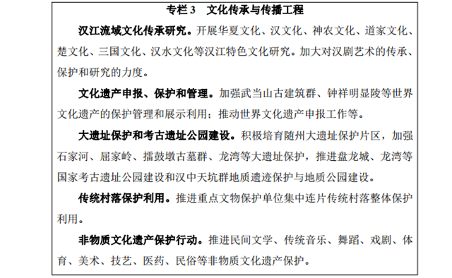 加強文化傳承與傳播。開展文化遺產(chǎn)的調(diào)查,建立漢江歷史文 化遺產(chǎn)保護傳承數(shù)據(jù)庫,做好世界文化遺產(chǎn)的申報、保護與管理, 推進大遺址保護和考古遺址公園建設,對丹江口庫區(qū)淹沒區(qū)瀕危文 物實施搶救保護。加強歷史文化名城、名鎮(zhèn)、名村的保護,有條件 的地區(qū)實行連片保護和適度開發(fā)。推進革命文物和水下文化遺產(chǎn)保 護。加強非物質(zhì)文化遺產(chǎn)的挖掘與保護,深入開展傳統(tǒng)文化研究, 挖掘優(yōu)秀傳統(tǒng)文化的歷史淵源、時代內(nèi)涵和現(xiàn)實價值。聯(lián)合開展?jié)h 江文化旅游節(jié)等特色節(jié)慶活動,打造文化活動品牌。