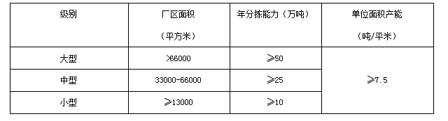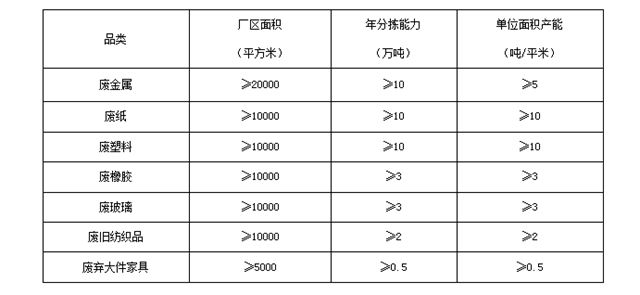 指分揀品類不少于二類,分揀能力和用地面積規(guī)劃設(shè)計(jì),應(yīng)以再生資源分揀用地標(biāo)準(zhǔn)和本區(qū)域再生資源實(shí)際產(chǎn)生量為準(zhǔn)??煞譃榇?、中、小型三個級別,各級別綜合型分揀中心的年分揀能力和廠區(qū)面積如下: