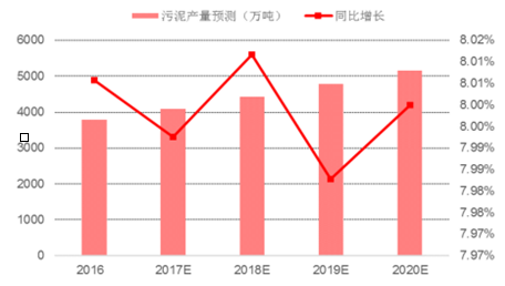 根據(jù)報(bào)告,2015 年我國(guó)城鎮(zhèn)污泥年產(chǎn)量達(dá)到 3500 萬(wàn)噸,較 2014 年同比增長(zhǎng) 16%。據(jù)中國(guó)產(chǎn)業(yè)信息網(wǎng)的測(cè)算,未來幾年我國(guó)污泥產(chǎn)生量將逐年穩(wěn)步增加,預(yù)計(jì)年增長(zhǎng)率為 8%左右, 2020 年達(dá)到5157 萬(wàn)噸。
