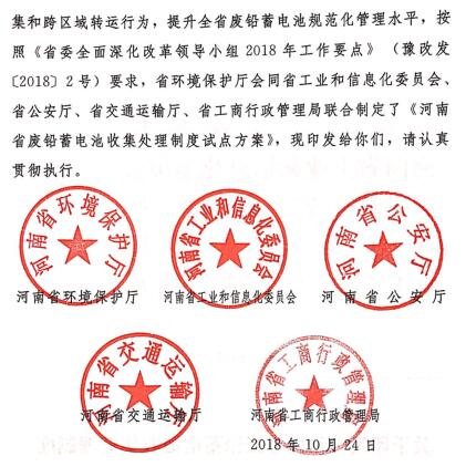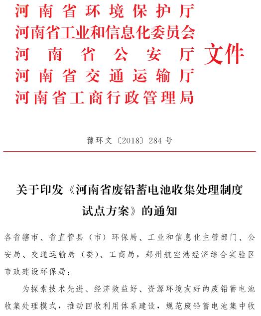 為貫徹落實 《中華人民共和國固體廢物污染環(huán)境防治法》、《危險廢物經(jīng)營許可證管理辦法》和國務院辦公廳 《生產(chǎn)者責任延伸制度推行方案》 (國辦發(fā) 〔2016 〕 99 號),探索技術(shù)經(jīng)濟性強、資源環(huán)境友好的多元化廢鉛蓄電池收集處理模式,推動回收利用體系建設,按照 《省委全面深化改革領(lǐng)導小組 2018 年工作要點》(豫改發(fā) 〔2018 〕 2 號)、 《 2018 年河南省生態(tài)文明體制改革實施方案》 (豫環(huán)委辦 〔2018 〕 14 號)要求,結(jié)合河南實際,制定本方案。