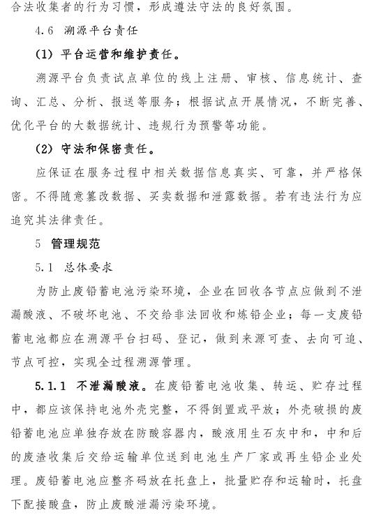 建立廢鉛蓄電池溯源管理平臺,探索廢鉛蓄電池全過程溯源管理模式,實行廢鉛蓄電池全過程線上信息跟蹤。鉛蓄電池生產(chǎn)企業(yè)、經(jīng)銷商、銷售網(wǎng)點、再生鉛企業(yè)及其回收體系、運輸企業(yè)等參與廢鉛蓄電池回收的各責任主體,要在溯源管理平臺注冊登記。參與廢鉛蓄電池回收的各責任主體收到廢鉛蓄電池后及時粘貼二維碼、掃碼錄入信息,實現(xiàn)廢鉛蓄電池自產(chǎn)生至再生鉛企業(yè)來源可查、去向可追、全程可控的目標。