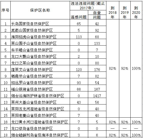 (二)自然保護(hù)區(qū)違法違規(guī)問(wèn)題。2018年底前,國(guó)家級(jí)、省級(jí)自然保護(hù)區(qū)突出問(wèn)題82%以上完成整改并開(kāi)展驗(yàn)收銷(xiāo)號(hào)。2019年底前,國(guó)家級(jí)、省級(jí)自然保護(hù)區(qū)突出問(wèn)題92%以上完成整改并開(kāi)展驗(yàn)收銷(xiāo)號(hào)。2020年底前,國(guó)家級(jí)、省級(jí)自然保護(hù)區(qū)突出問(wèn)題100%完成整改并開(kāi)展驗(yàn)收銷(xiāo)號(hào)。