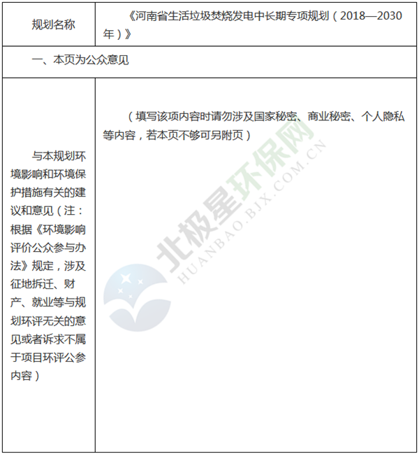 河南省生活垃圾焚燒發(fā)電中長期專項規(guī)劃(2018-2030年)環(huán)境影響評價公眾意見表