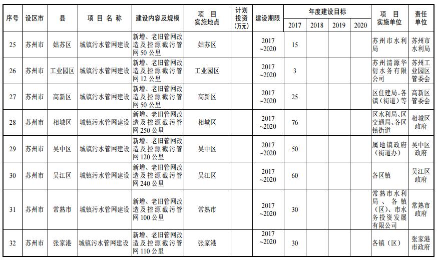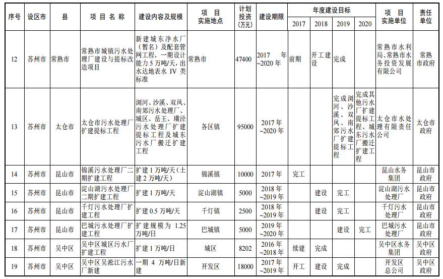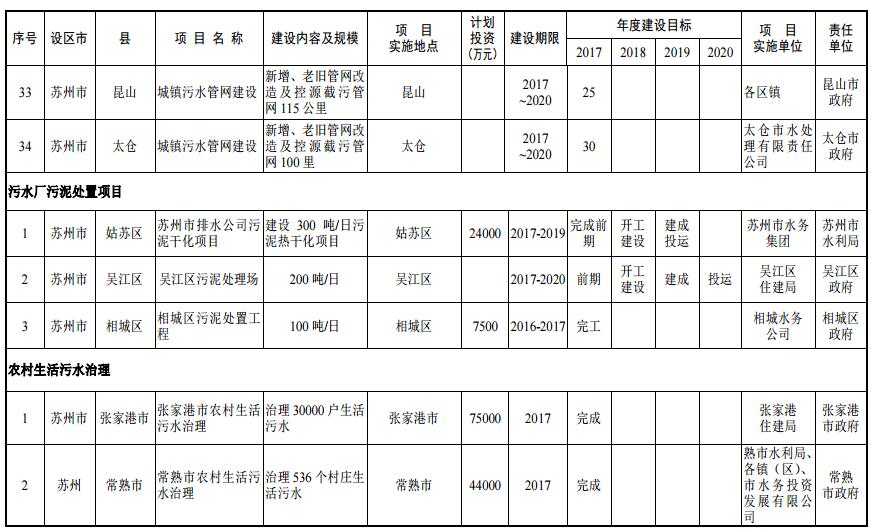 到 2020 年,蘇州市區(qū)、縣級(jí)市建成區(qū)生活污水基本實(shí)現(xiàn)全收集、全處理;全面推進(jìn)城鎮(zhèn)污水處理設(shè)施建設(shè),到 2019 年,蘇州市區(qū)、縣級(jí)市污水處理率分別達(dá)到 95%、85%。到 2020 年,蘇州市區(qū)、縣級(jí)市污水處理率分別達(dá)到 98%、90%;加強(qiáng)污泥處理處置,2017 年底前,完成現(xiàn)有城鎮(zhèn)污水處理廠污泥處理處置設(shè)施達(dá)標(biāo)改造,設(shè)區(qū)、縣級(jí)市建成城鎮(zhèn)污水處理廠污泥綜合利用或永久性處理處置。2020 年底前,縣級(jí)市實(shí)現(xiàn)永久性污泥處理處置設(shè)施全覆蓋。