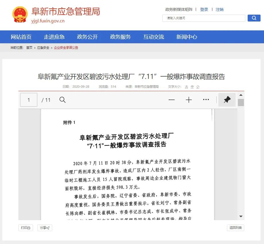 文章導讀近日,阜新市應急管理局已經(jīng)發(fā)布了《阜新氟產(chǎn)業(yè)開發(fā)區(qū)碧波污水處理廠“7.11”一般爆炸事故調(diào)查報告》(下稱《報告》)。結果顯示,爆炸的直接原因是該污水廠違規(guī)使用氯酸鈉催化劑,在儲存時與赤砂糖發(fā)生化學反應發(fā)生爆炸,爆炸現(xiàn)場形成的沖擊波相當1.0-1.5tTNT當量。還記得去年7月12日,遼寧省阜...