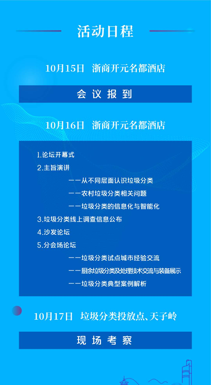 文章導(dǎo)讀中國(guó)城市環(huán)境衛(wèi)生協(xié)會(huì)垃圾分類專業(yè)委員會(huì)舉辦的“2020 垃圾分類杭州高峰論壇”,將于2020 年 10 月 15 日—17 日在杭州舉行。會(huì)議以“找差距、補(bǔ)短板,強(qiáng)化垃圾分類全過程管理”為主題,將薈萃全國(guó)環(huán)衛(wèi)領(lǐng)域精英,包括中國(guó)城市環(huán)境衛(wèi)生協(xié)會(huì)會(huì)長(zhǎng)徐文龍、中國(guó)城市環(huán)境衛(wèi)生協(xié)會(huì)秘書長(zhǎng)劉晶昊、中國(guó)...