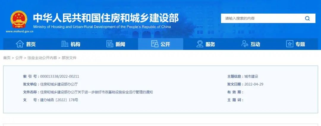 住房和城鄉(xiāng)建設(shè)部辦公廳關(guān)于進(jìn)一步做好市政基礎(chǔ)設(shè)施安全運行管理的通知建辦城函〔2022〕178號各省、自治區(qū)住房和城鄉(xiāng)建設(shè)廳,北京市城市管理委、園林綠化局、水務(wù)局,天津市城市管理委、水務(wù)局,上海市住房和城鄉(xiāng)建設(shè)管委、綠化和市容管理局、水務(wù)局,重慶市住房和城鄉(xiāng)建設(shè)委、經(jīng)濟(jì)和信息化委、城市管理局,海南省水...