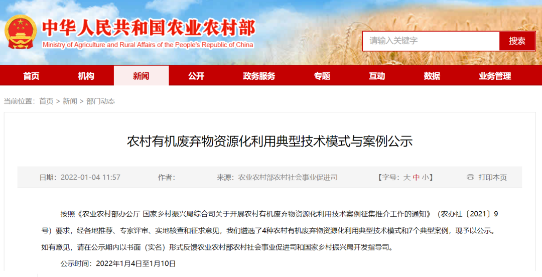 為貫徹落實(shí)《農(nóng)村人居環(huán)境整治提升五年行動(dòng)方案(2021—2025年)》部署要求,提高農(nóng)村易腐垃圾、廁所糞污等有機(jī)廢棄物無(wú)害化處理和資源化利用水平,強(qiáng)化實(shí)用技術(shù)供給,農(nóng)業(yè)農(nóng)村部、國(guó)家鄉(xiāng)村振興局在各省(區(qū)、市)推薦的基礎(chǔ)上,經(jīng)專家評(píng)審、實(shí)地核查,遴選了4種農(nóng)村有機(jī)廢棄物資源化利用典型技術(shù)模式和7個(gè)典型案...