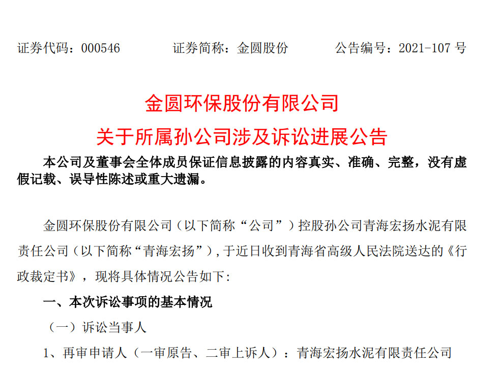 因?yàn)?萬(wàn)元的環(huán)保處罰,導(dǎo)致3655萬(wàn)元稅收優(yōu)惠沒有了,是不是有點(diǎn)因小失大?2021年12月29日,金圓環(huán)保股份有限公司(下稱“金圓股份”)發(fā)布公告,宣布了一起所屬孫公司青海宏揚(yáng)水泥有限責(zé)任公司(下稱“青海宏揚(yáng)”)涉及訴訟的進(jìn)展,青海宏揚(yáng)要求確認(rèn)環(huán)保處罰無(wú)效的再審申請(qǐng)被法院駁回。這意味著,經(jīng)歷了一審、...