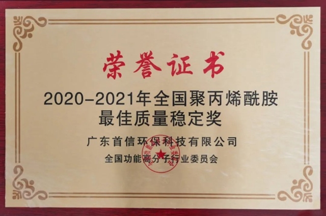 2020-2021年全國聚丙烯酰胺最佳質(zhì)量穩(wěn)定獎已出爐,本次獲得該項榮譽的是——廣東首信環(huán)保材料科技有限公司??上病⒖少R、更可嘆!首信環(huán)保獲全國聚丙烯酰胺最佳質(zhì)量穩(wěn)定獎 事實上,廣東首信環(huán)保材料科技有限公司(下稱“首信環(huán)保”)已經(jīng)不是第一次獲得該項榮譽...