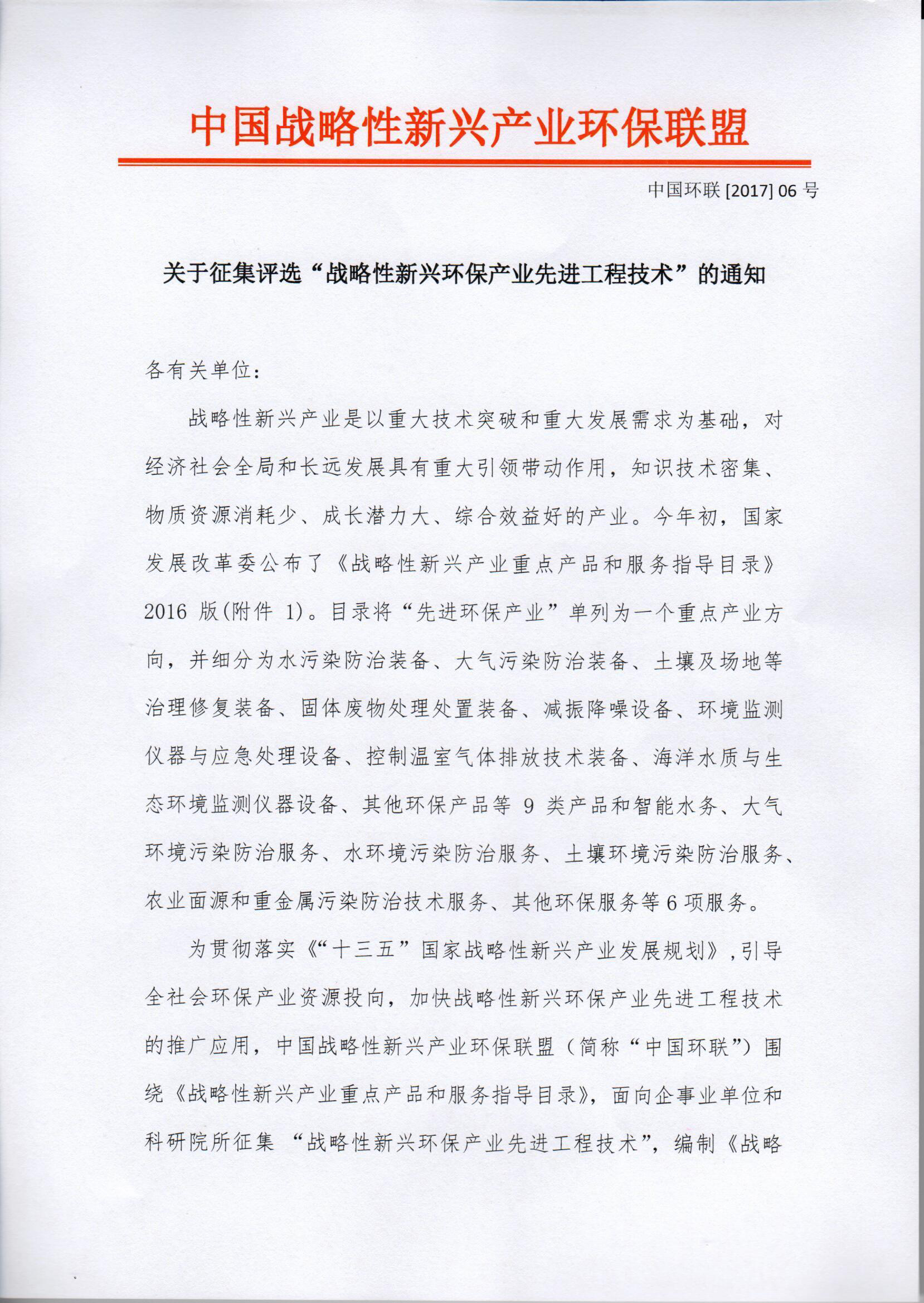 關(guān)于征集評(píng)選“戰(zhàn)略性新興環(huán)保產(chǎn)業(yè)先進(jìn)工程技術(shù)”的通知各有關(guān)單位:戰(zhàn)略性新興產(chǎn)業(yè)是以重大技術(shù)突破和重大發(fā)展需求為基礎(chǔ),對(duì)經(jīng)濟(jì)社會(huì)全局和長遠(yuǎn)發(fā)展具有重大引領(lǐng)帶動(dòng)作用,知識(shí)技術(shù)密集、物質(zhì)資源消耗少、成長潛力大、綜合效益好的產(chǎn)業(yè)。今年初,國家發(fā)展改革委公布了《戰(zhàn)略性新興產(chǎn)業(yè)重點(diǎn)產(chǎn)品和服務(wù)指導(dǎo)目錄》2016版...