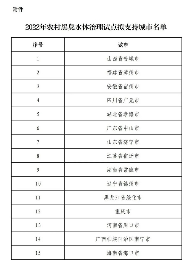 財政部公示2022年農(nóng)村黑臭水體治理試點支持城市名單