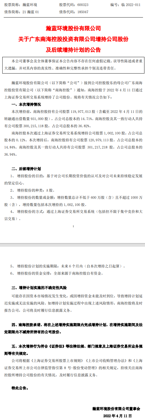 2022年4月11日,瀚藍(lán)環(huán)境股份有限公司(下稱“瀚藍(lán)環(huán)境”)發(fā)布公告稱,廣東南??毓赏顿Y有限公司(下稱“南??毓?rdquo;)已成功通過上海證券交易所交易系統(tǒng)增持了股份。 據(jù)了解,本次增持前,南海控股持有瀚藍(lán)環(huán)境14.71%的股份,及其一致行動人共持有瀚藍(lán)環(huán)境...